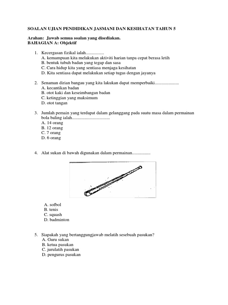 Soalan Ujian Bulanan Pendidikan Jasmani Dan Kesihatan Tahun 5 Sekolah Rendah Pdf